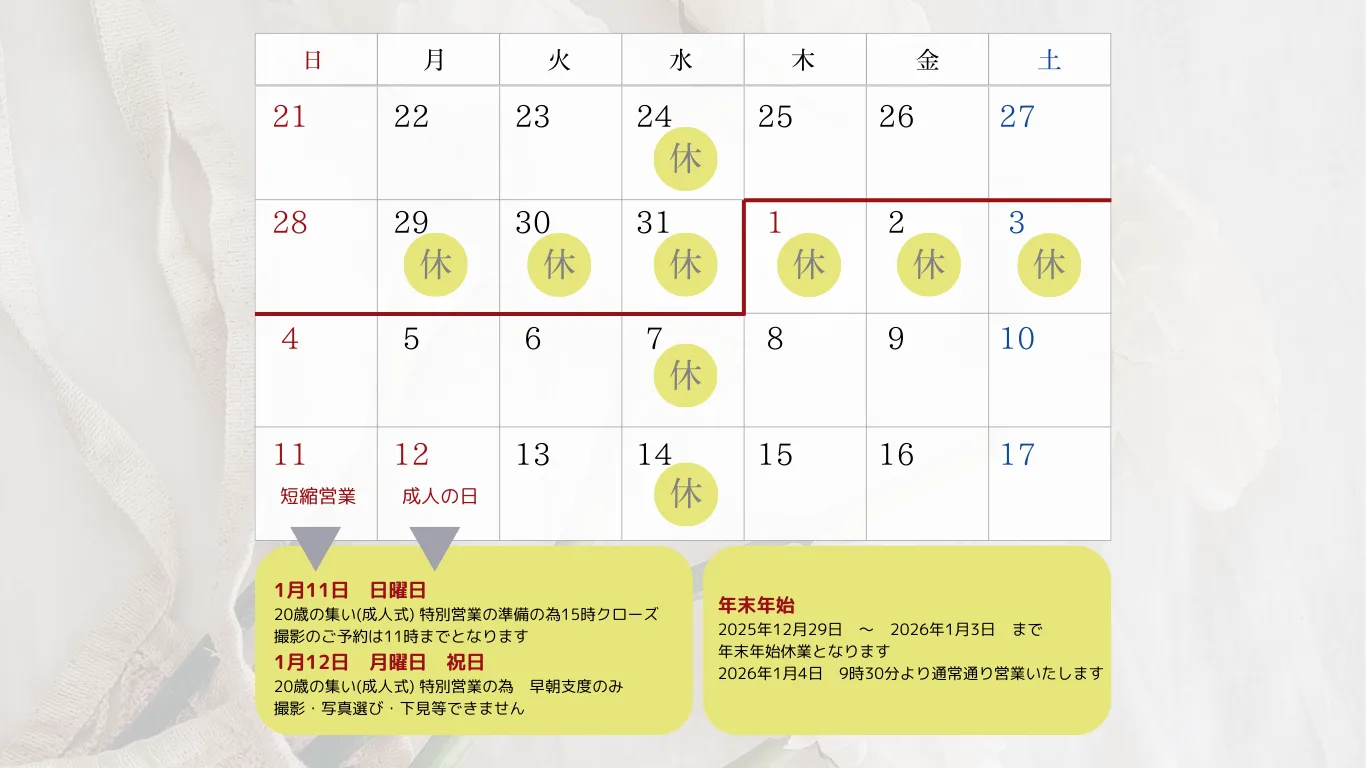 また、成人式(はたちの集い)以外の早朝支度は行なっておりませんので、必ずオープン時間の9:30以降のお支度開始となります。