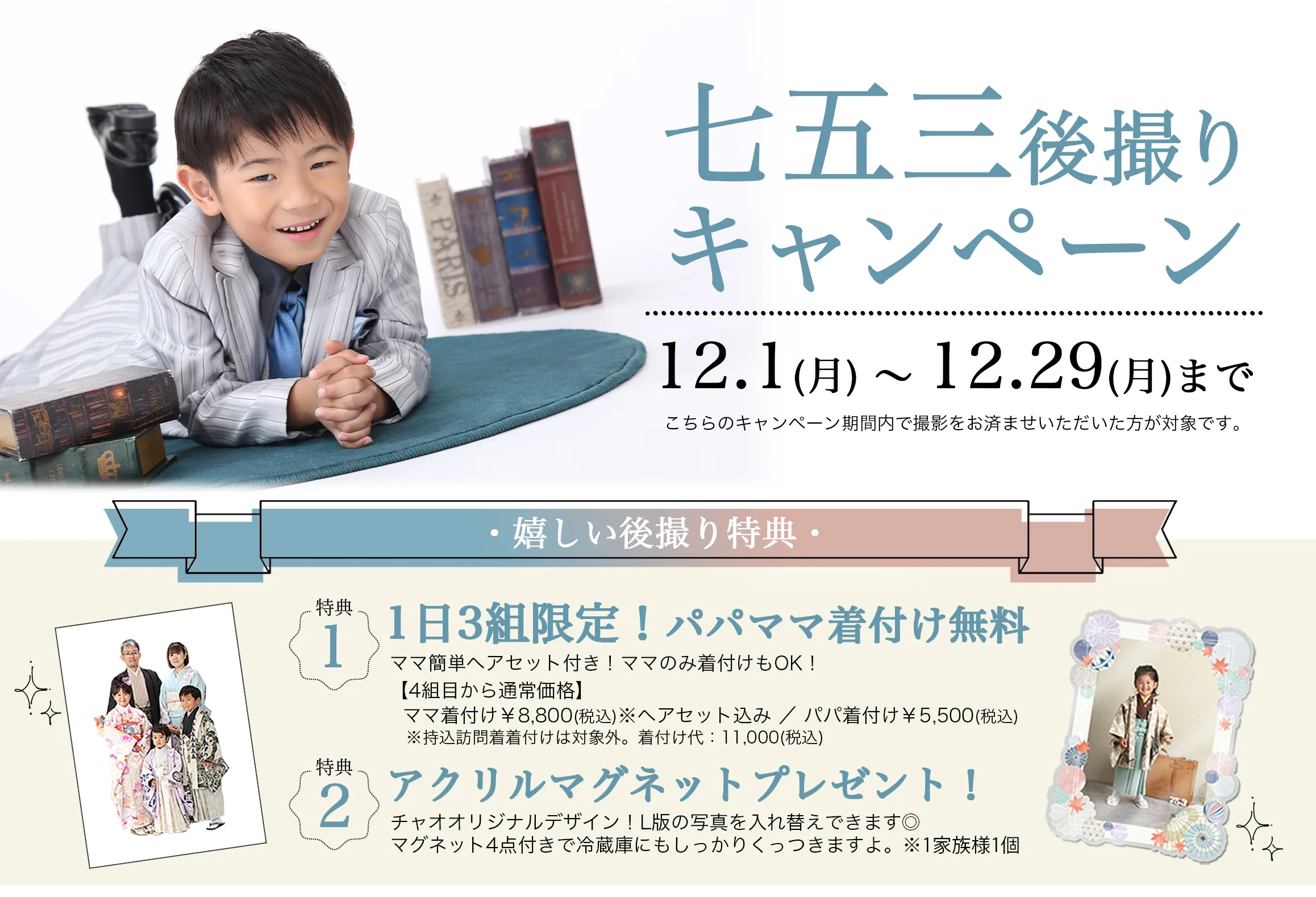 七五三は毎年5月ごろから前撮りのキャンペーンを行っております。